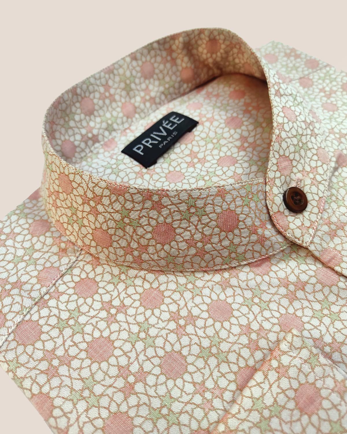 This traditional patterned shirt with its soft pastel cream-pink hue is the perfect attire for an Indian wedding. Made from lightweight fabric, it is ideal for summer events and will keep you looking cool and stylish. With its timeless design, you'll be sure to turn heads and make a statement at your next wedding!