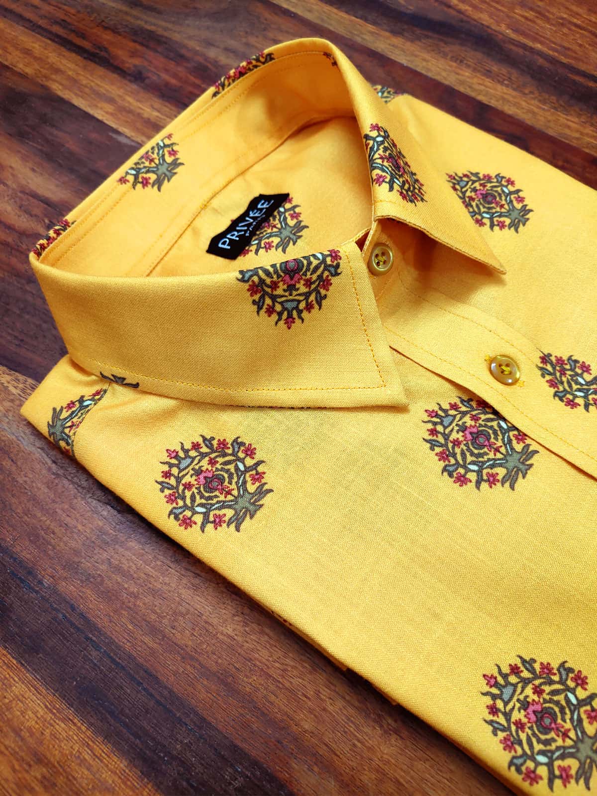This Floral Yellow Print Shirt is the perfect addition to your Haldi Ceremony attire. The vibrant floral print adds a touch of traditional elegance to your look. Made from high-quality fabric, it is soft and comfortable, allowing you to fully enjoy the festivities. Stand out in style with this must-have shirt.